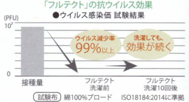 フルテクトケットの抗ウイルス加工の効果は、10回洗濯後も持続します。(50回まで確認済み。)