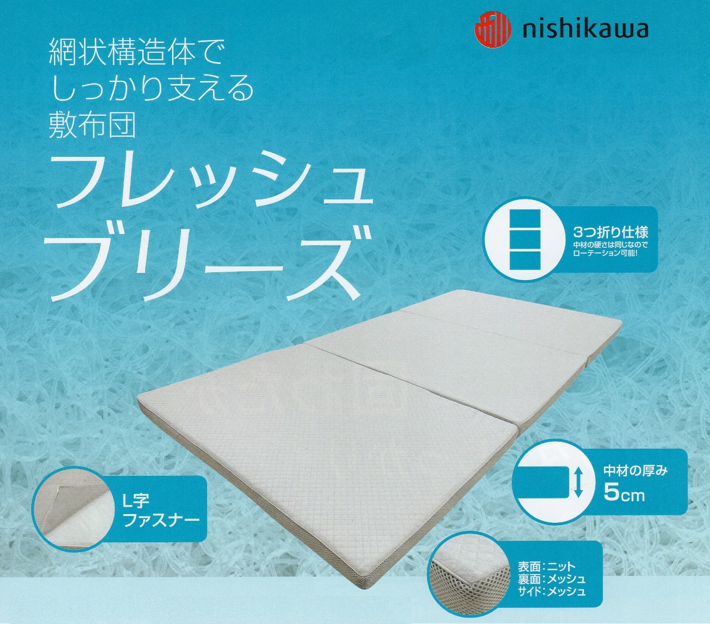 西川フレッシュブリーズ敷布団網状構造体の浮遊感5㎝厚三つ折り